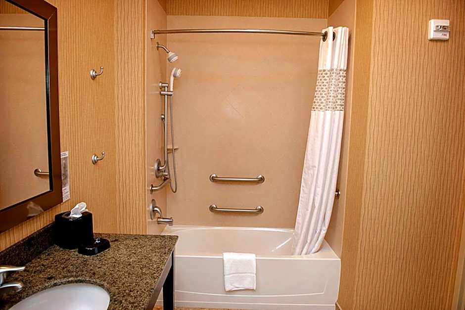 This studio has a seating area, small refrigerator, coffee machine, and microwave. The accessible bathroom has a roll-in shower, hairdryer, and free toiletries.